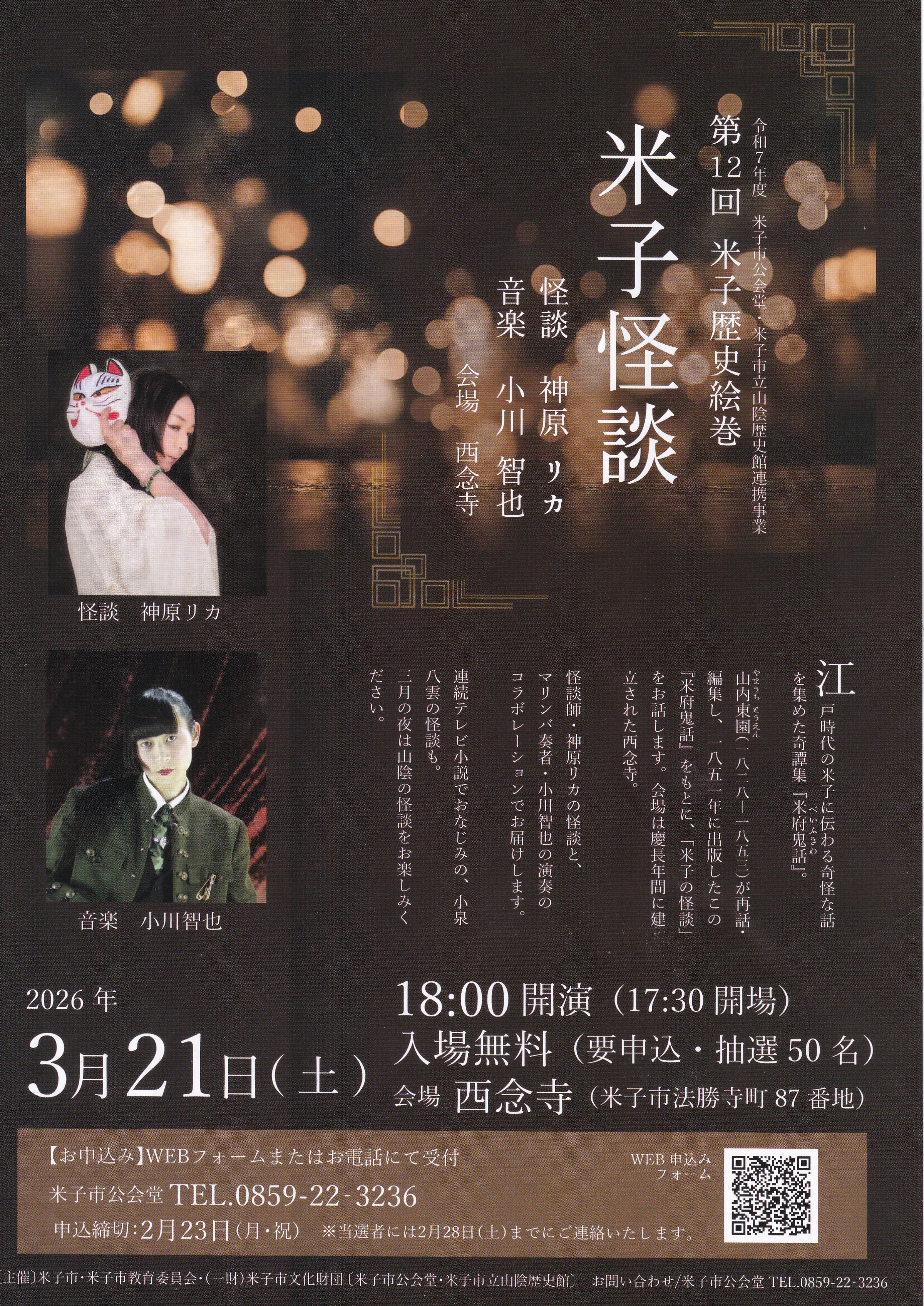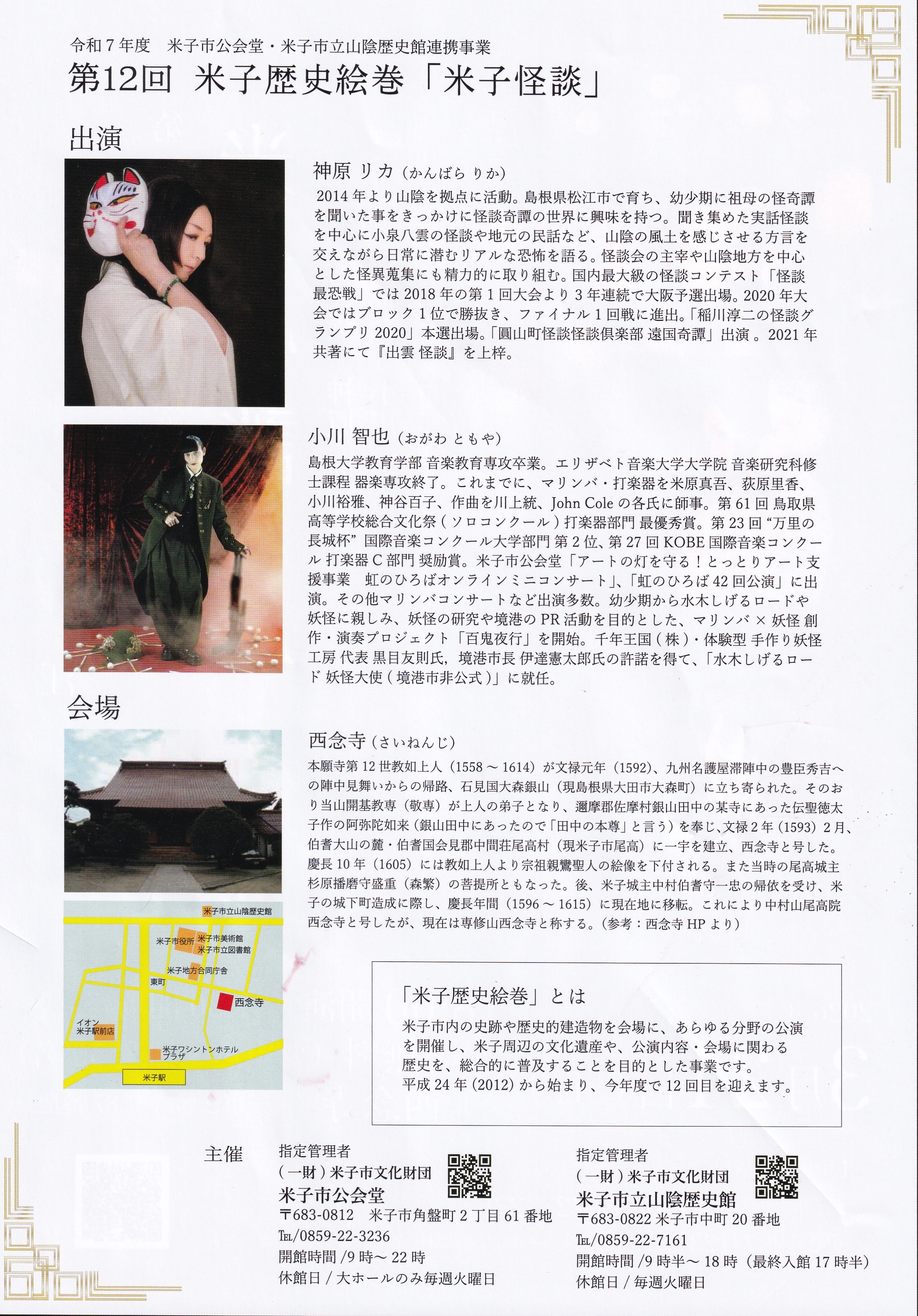 来る3月21日(土)、当寺を会場として「第12回米子歴史絵巻・米子怪談」が開催されます。 3月21日(土)18:00開演(17:30開場) 【お申込み】締切:2月23日(月・祝) ※西念寺へのお問い合わせはご遠慮ください。 |